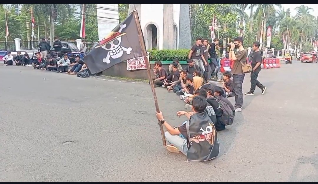 Dalam aksinya, massa membuang tumpukan sampah di depan Kantor Bupati sebagai bentuk protes. Mereka juga mengibarkan bendera bajak laut One Piece, sebagai simbol perlawanan terhadap kebijakan yang dianggap mengorbankan rakyat kecil demi keuntungan sepihak.