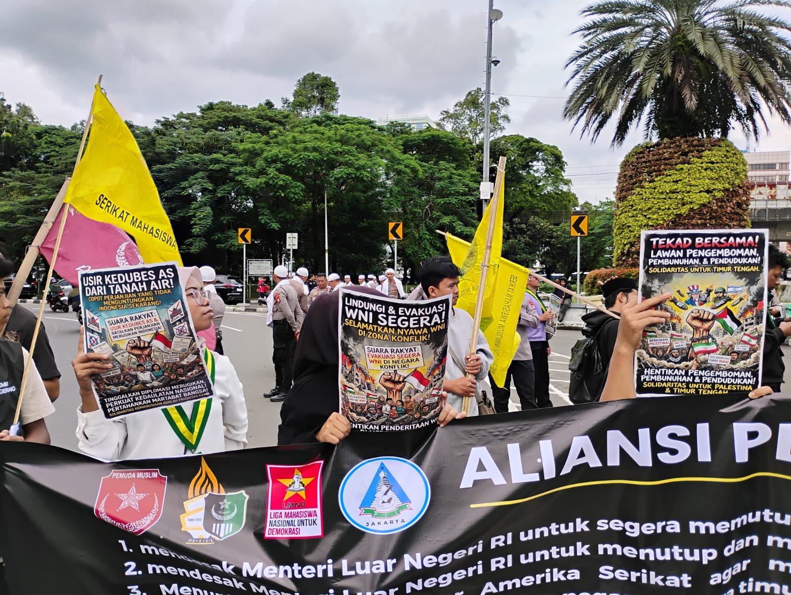 JAKARTA, PUSATBERITA – Ratusan massa yang tergabung dalam Aliansi Peduli Iran (API) yang terdiri dari Pemuda Muslimin DKI Jakarta, SEMMI Jakarta Raya, dan LMND DKI Jakarta menggelar aksi unjuk rasa di depan Kedutaan Besar (Kedubes) Amerika Serikat dan Kantor Kementerian Luar Negeri RI pada Jumat (06/03/2026).