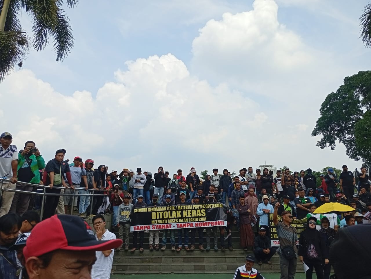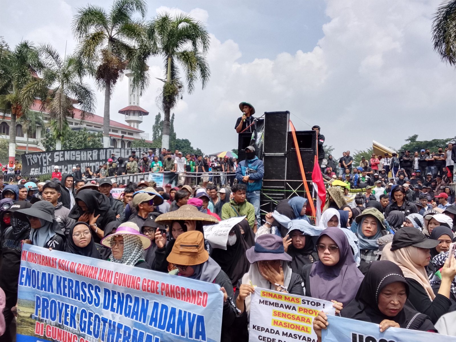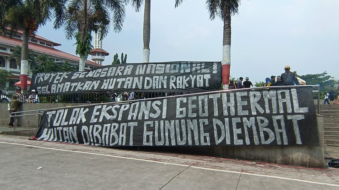 Pantauan reporter Pusat-berita.com, sekitar 200 massa aksi tiba pukul 11:00 WIB dengan membawa berbagai poster dengan bertulisan “Gede Pangrango Bukan Untuk Geothermal”, “Proyek Sengsara Nasional”, dan “Massa Depan Kita Bukan Proyek Mereka”.