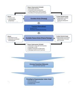 Pendekatan ini menempatkan manusia sebagai makhluk yang utuh—meliputi dimensi jasmani, psikis, dan spiritual—sehingga praktik keperawatan tidak hanya berorientasi pada penyembuhan penyakit, tetapi juga pada pemeliharaan kesehatan dan keberlanjutan kehidupan manusia secara holistik. Berikut gambaran konseptual praktik keperawatan pada masa Islam Awal yang dilakukan Rufaidah al-Aslamiyyah dalam bentuk diagram di bawah ini.