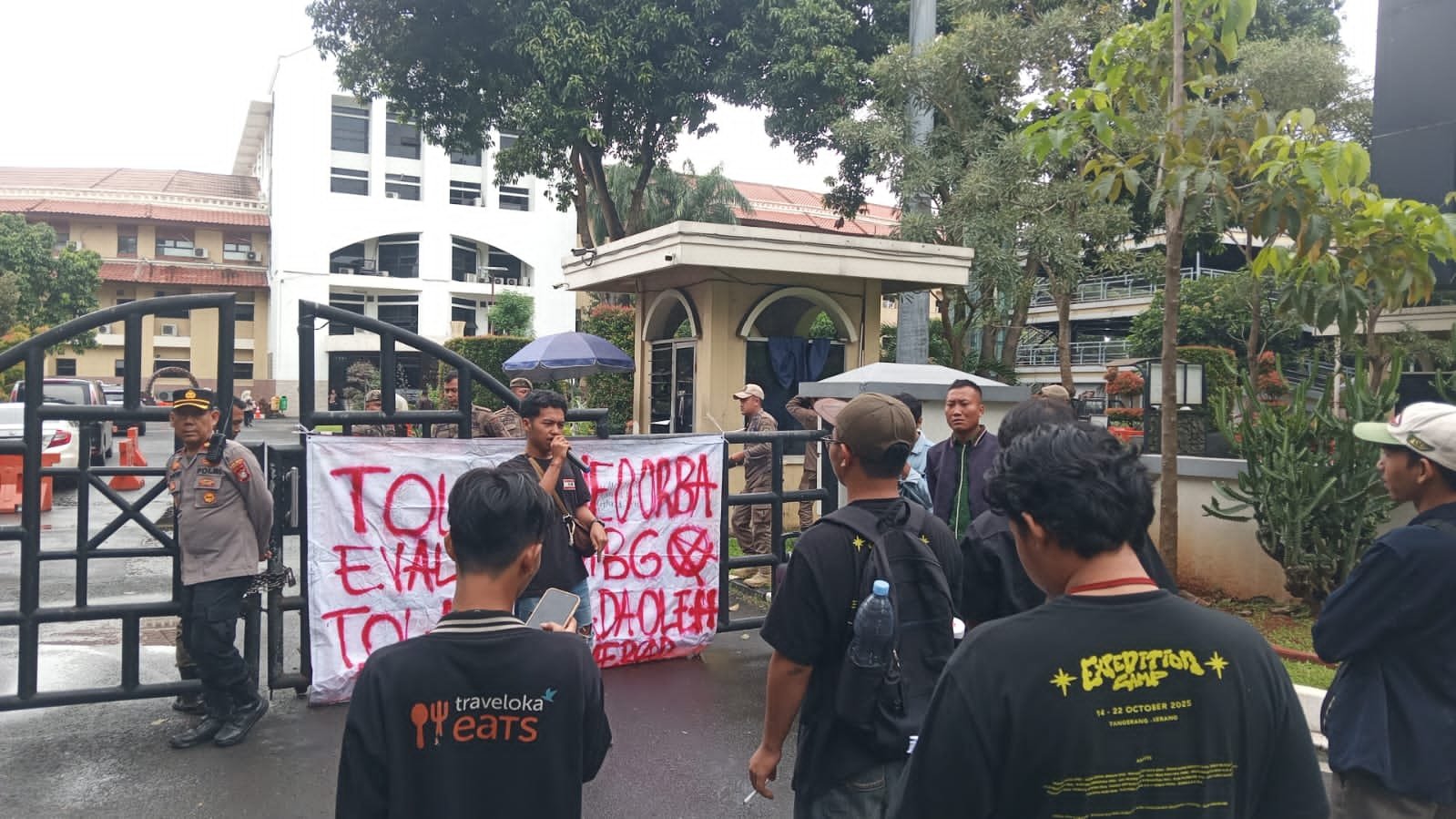 Koordinator Aksi KameraD, Aditya Nugraha dalam orasinya di depan Kantor DPRD Kota Tangerang, Kamis (15/1) 2026 (Foto: Topan Bagaskara/PusatBerita).