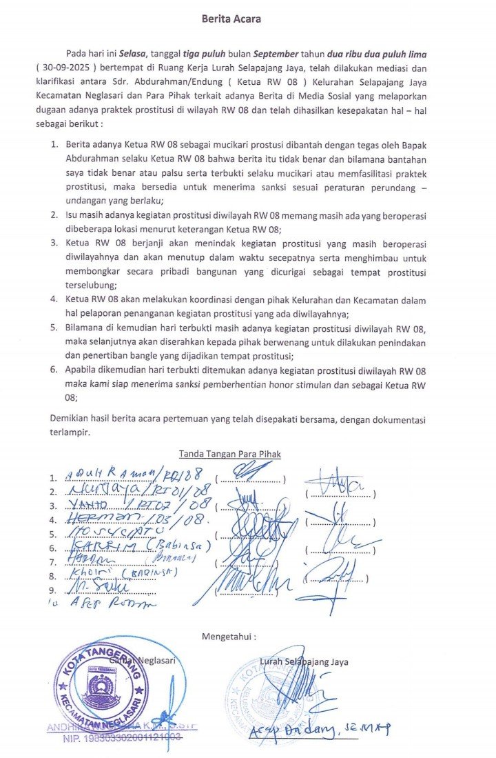 Forum mediasi digelar di Kantor Kelurahan Selapajang Jaya, pada Selasa (30/9) 2025. Forum tersebut dihadiri oleh Ketua Rukun Warga (RW) 08 berserta Ketua RTnya, Kasi Tapem Kec. Neglasari, dan perwakilan dari Tramtib Neglasari, Babinsa dan Binamas setempat.